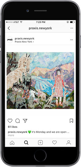 Pro Tip: Praxis’s recommendation is simple: “Post every day.” Experiment with different kinds of content to see what performs well. Whether it’s a featured artwork each day or a video from an artist’s studio, regularly sharing content on social media helps to surface your profile on Instagram and Facebook and attract new followers. But be realistic—if you know you won’t be able to keep up with daily posts, perhaps pick two to three days a week when you’ll always post.
